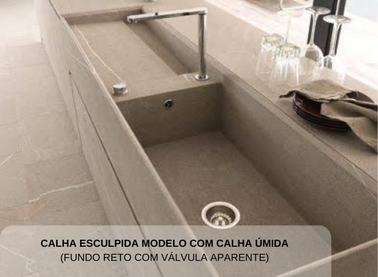 A cuba esculpida é feita diretamente na pedra. Ela esconde o ralo e escoamento da água, proporcionando um design mais moderno e sofisticado.